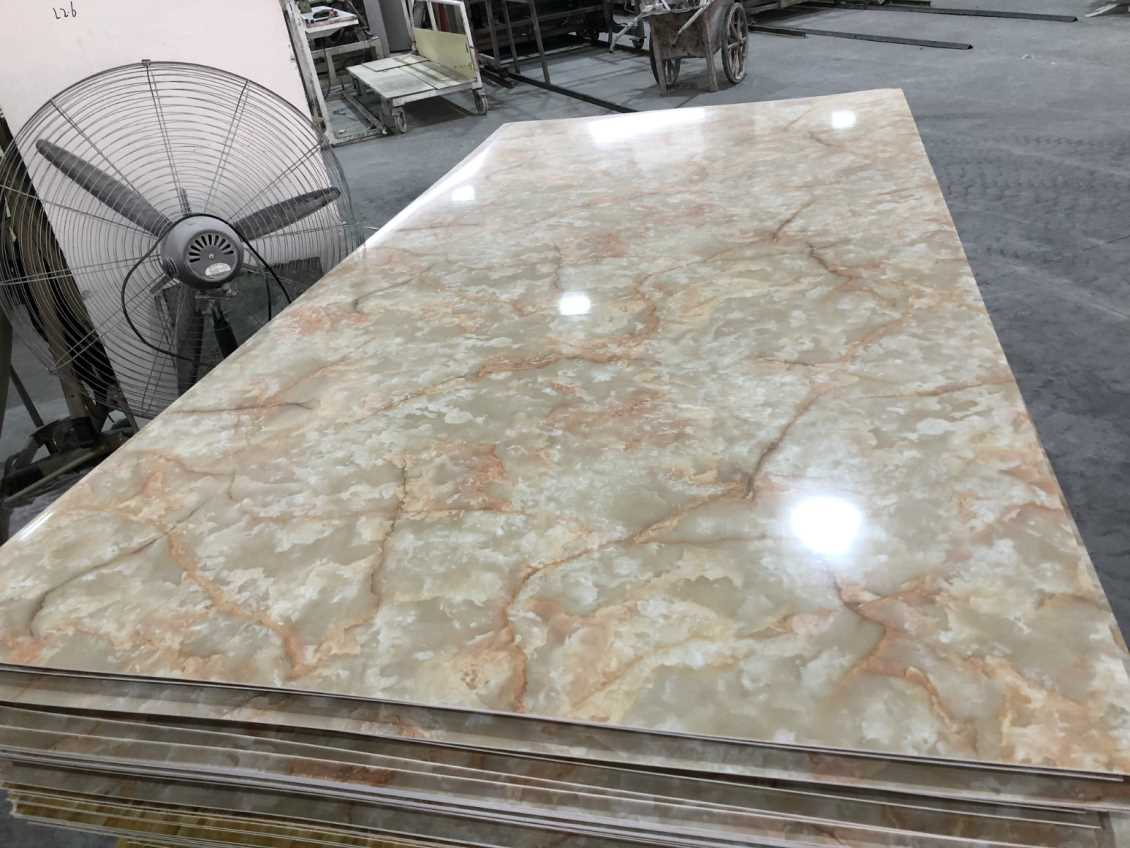 1、在选用仿大理石UV装饰板材的时候,厚度在6MM左右,整体花色要尽量协调,需要拼接的板材,提前裁剪好尺寸,保证施工时花纹能够完美拼接。